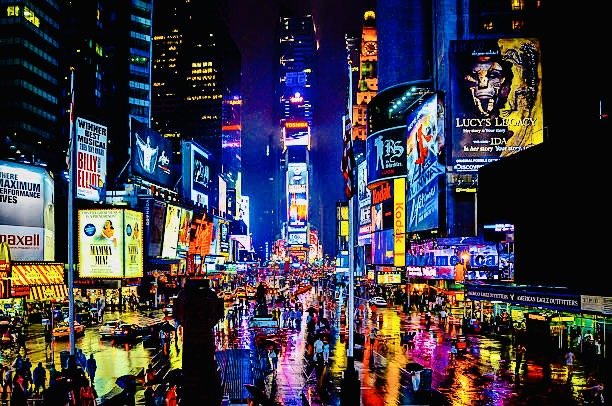 Times Square in New York on a rainy night. The phrase “The City That Never Sleeps” is most famously used to describe New York City, USA.